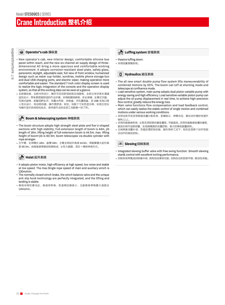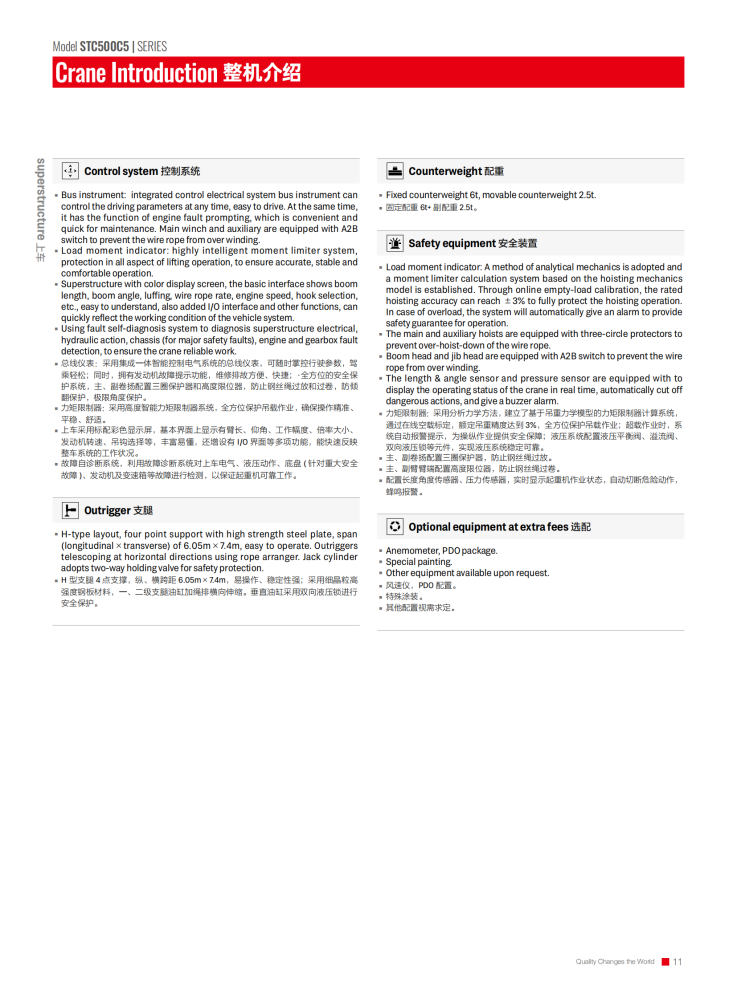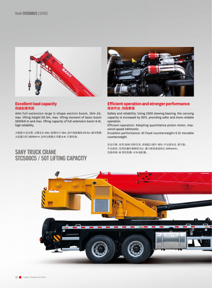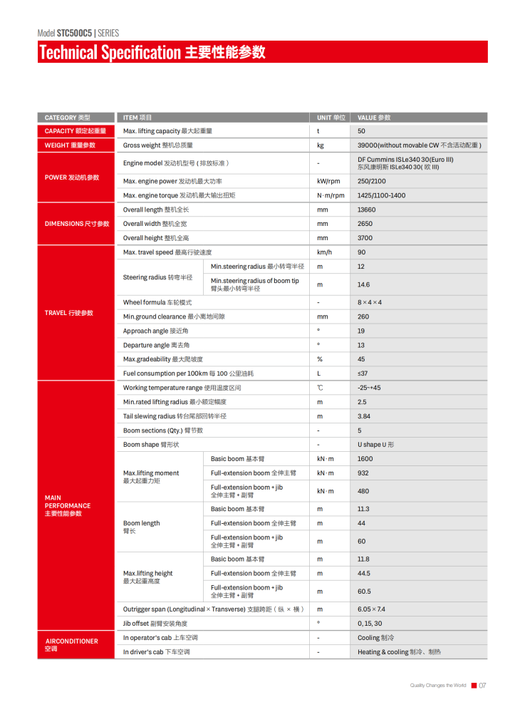 The STC500C5 truck crane is an outstanding piece of equipment for the construction industry, boasting a maximum rated gross lifting capacity of 50 tons, a maximum lifting height of 62.5 meters, and a maximum lifting torque of 2009 kN·m. Its large-section U-shaped main boom, combined with a jib, expands its operating range and adapts to diverse scenarios. Equipped with a Yuchai YCK08330-66 engine, it delivers a maximum power of 243/2200 kW/rpm and a top speed of 90 km/h. Its excellent maneuverability allows for rapid transitions and adaptability to complex terrain.