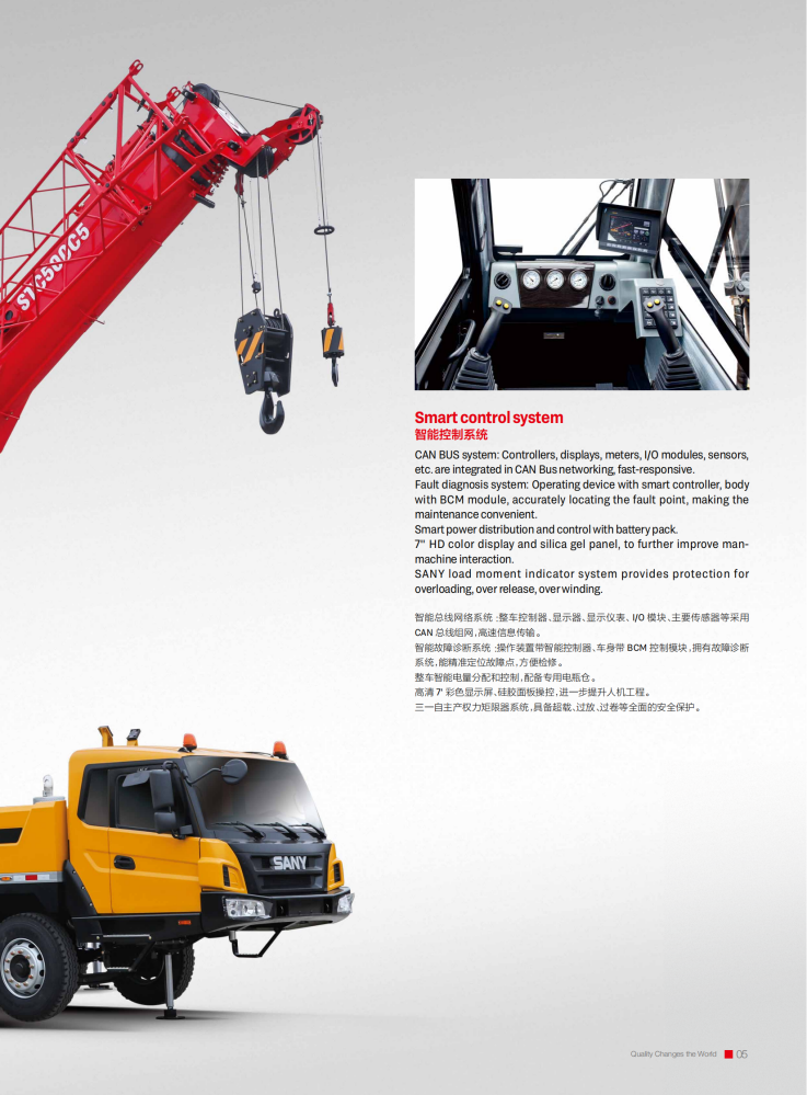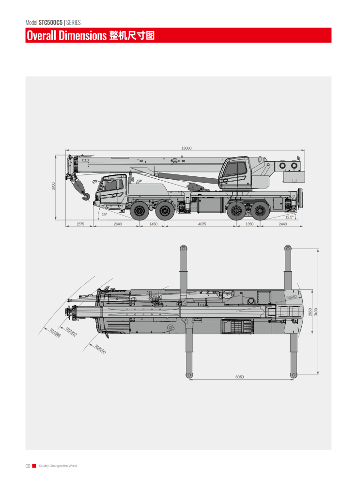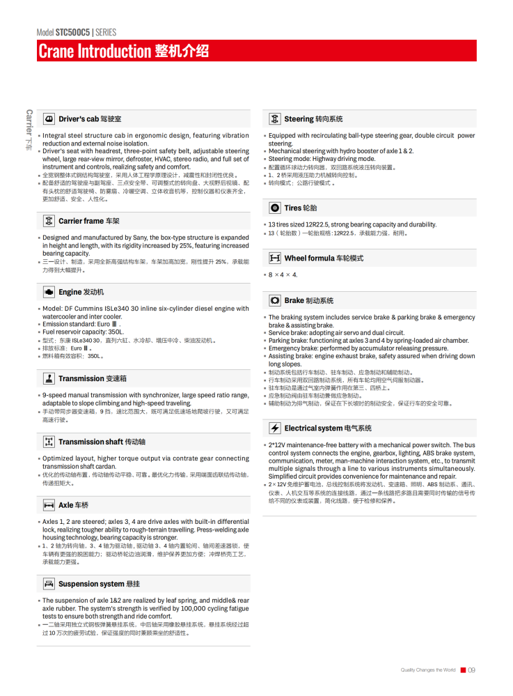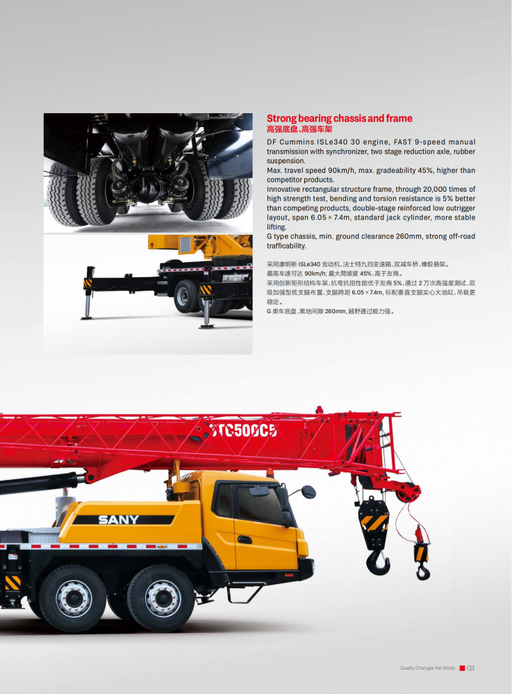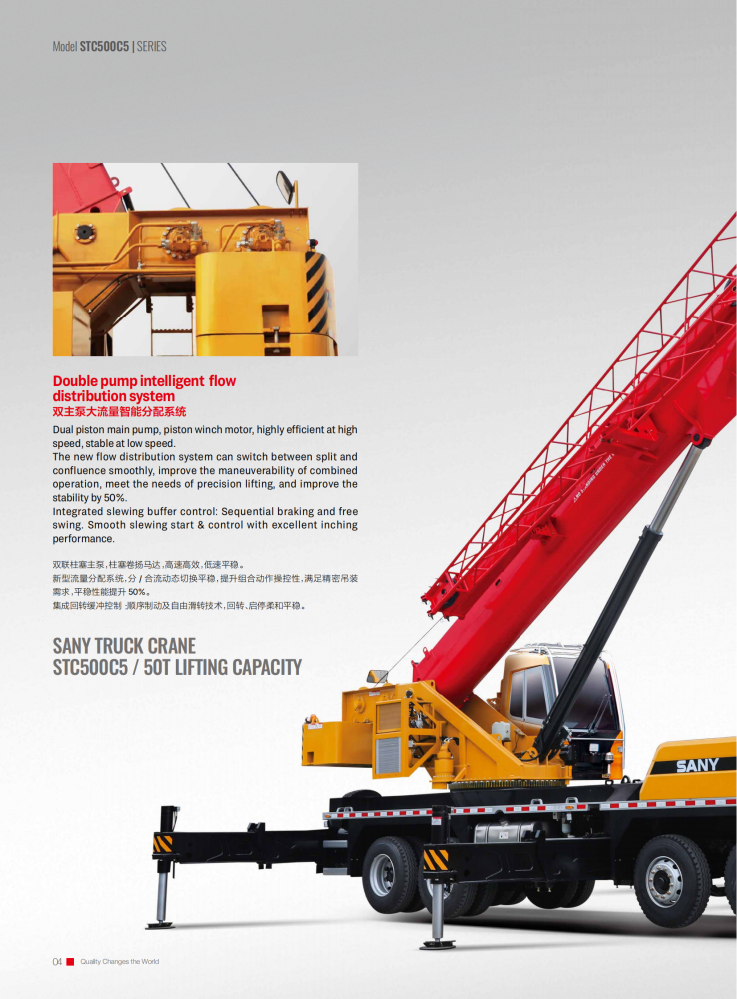 The STC500C5 truck crane is an outstanding piece of equipment for the construction industry, boasting a maximum rated gross lifting capacity of 50 tons, a maximum lifting height of 62.5 meters, and a maximum lifting torque of 2009 kN·m. Its large-section U-shaped main boom, combined with a jib, expands its operating range and adapts to diverse scenarios. Equipped with a Yuchai YCK08330-66 engine, it delivers a maximum power of 243/2200 kW/rpm and a top speed of 90 km/h. Its excellent maneuverability allows for rapid transitions and adaptability to complex terrain.