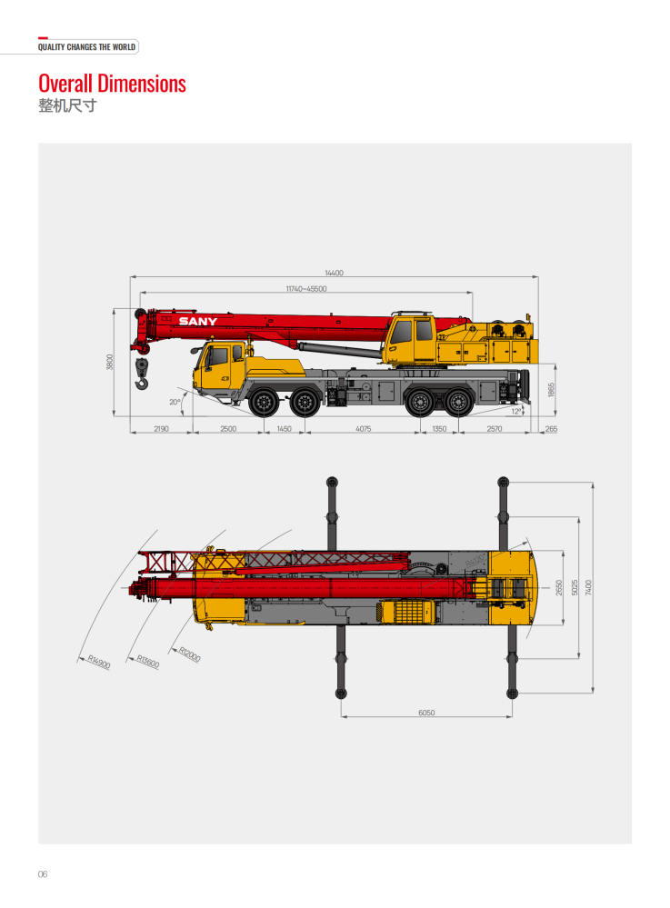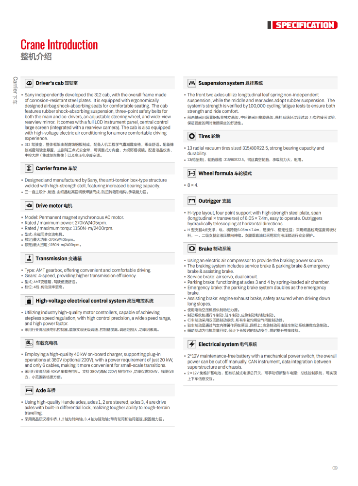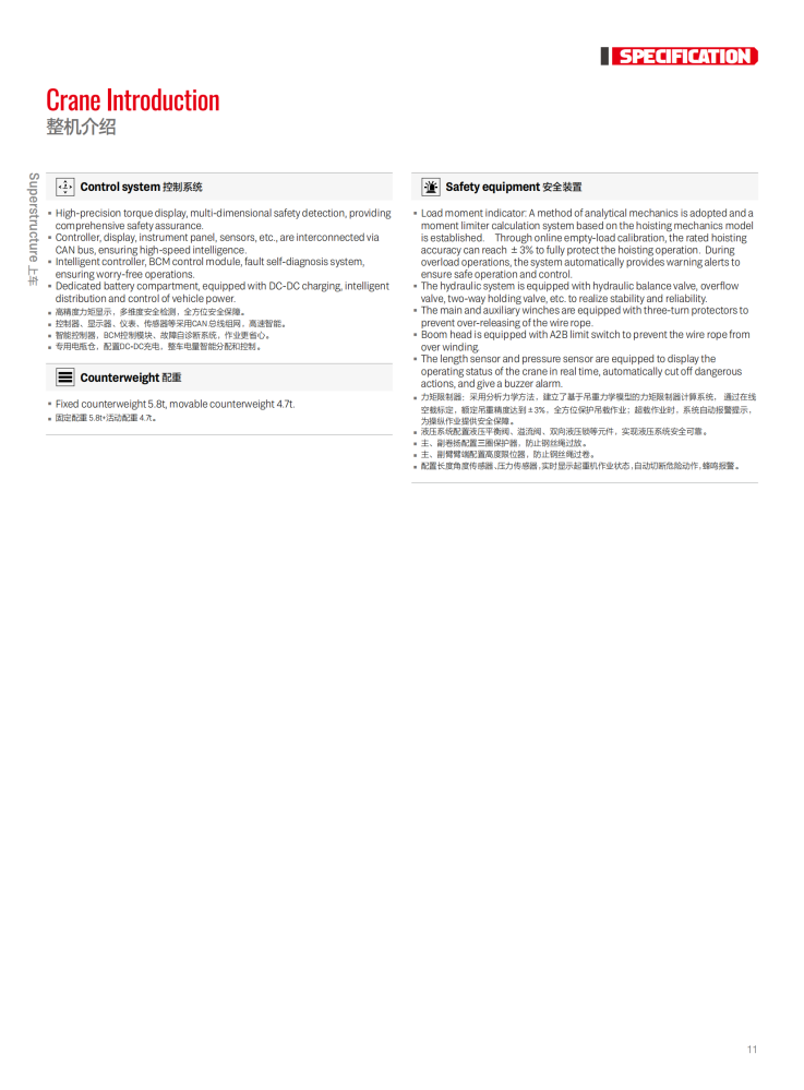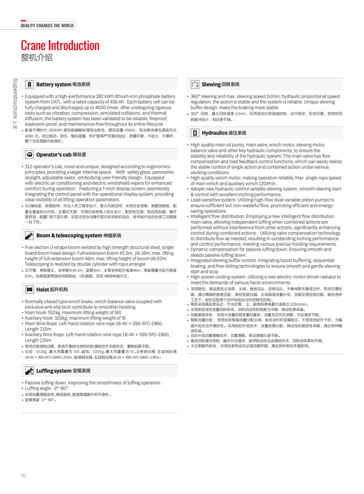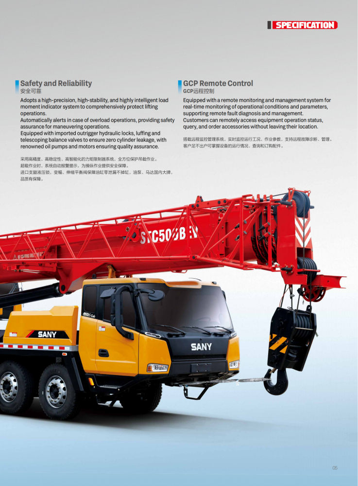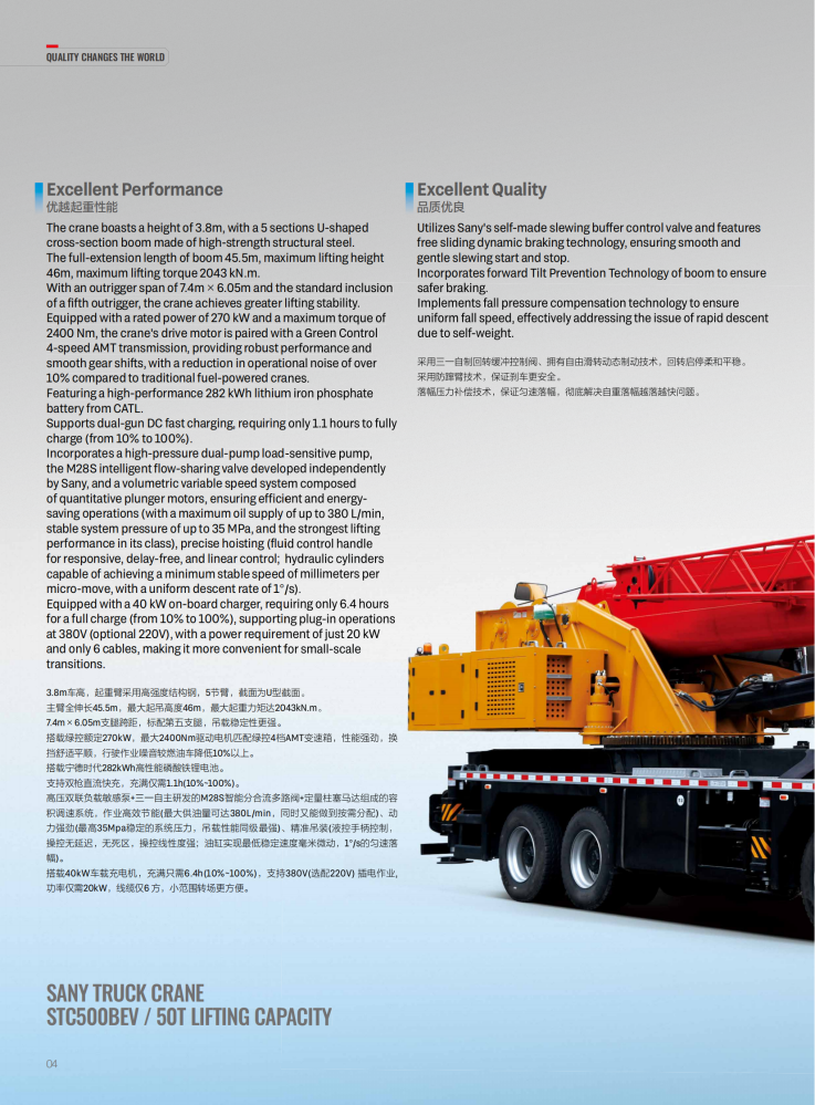 The STC500BEV is a 50-ton, all-electric truck crane. It boasts excellent lifting performance, with a maximum lifting capacity of 50 tons and a maximum lifting torque of 2,043 kN·m. Its main boom utilizes a five-section, U-shaped, high-strength structure, with a full extension of 45.5 meters and a maximum lifting height of 46 meters. It is powered by a CATL 282kWh high-performance lithium iron phosphate battery, a Green Control motor rated at 270kW and with a maximum torque of 2,400Nm, and a four-speed automatic manual transmission. It boasts a top speed of 95 km/h and a maximum gradeability of 51%.