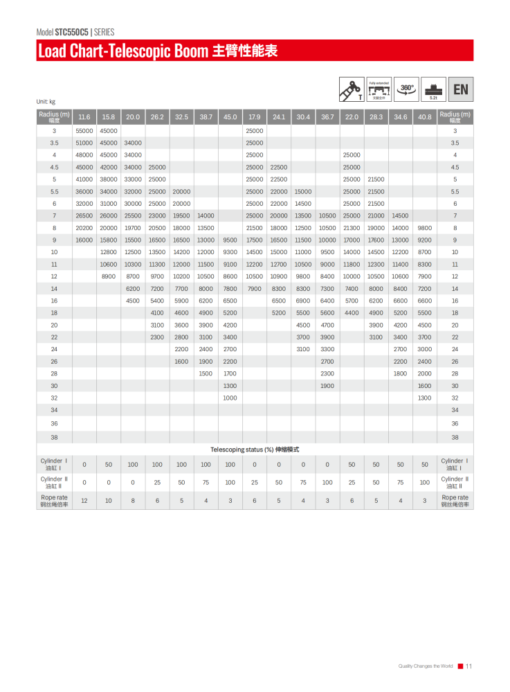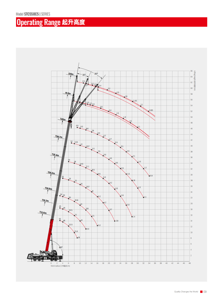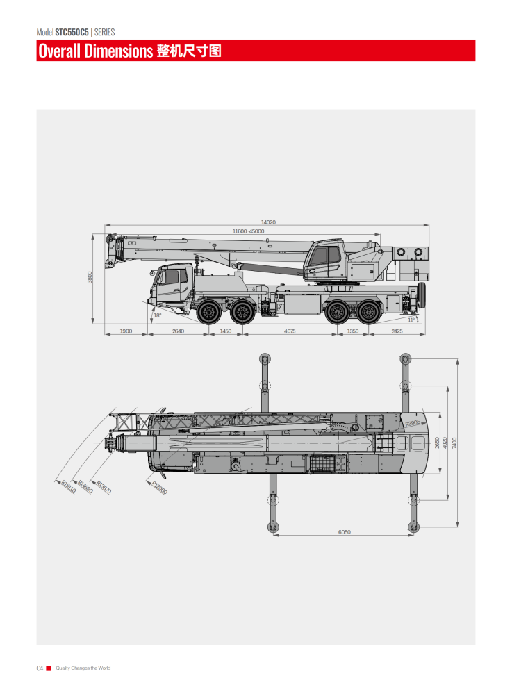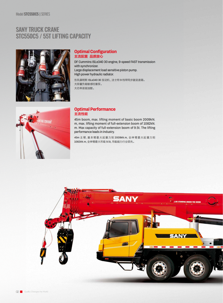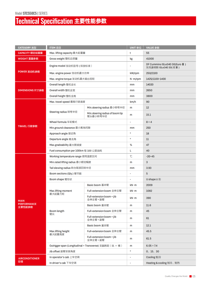 The STC550C5 is a high-efficiency 55-ton truck crane. It offers excellent lifting performance, with a maximum lift capacity of 55 tons and a lifting torque of 2,156 kN·m. Its main boom is 32.1 meters long, reaching a maximum reach of 47.5 meters, and its maximum lifting height is 64 meters. Powered by a powerful Yuchai 360-horsepower engine and a Fast Gear twin-intermediate shaft, the crane boasts a maximum speed of 85 km/h and a maximum gradeability of 47%. Equipped with 325/95R24 and 315/80R22.5 tires, it boasts an outrigger span of 7.7 meters horizontally and 6.24 meters vertically, providing excellent stability.