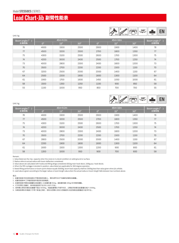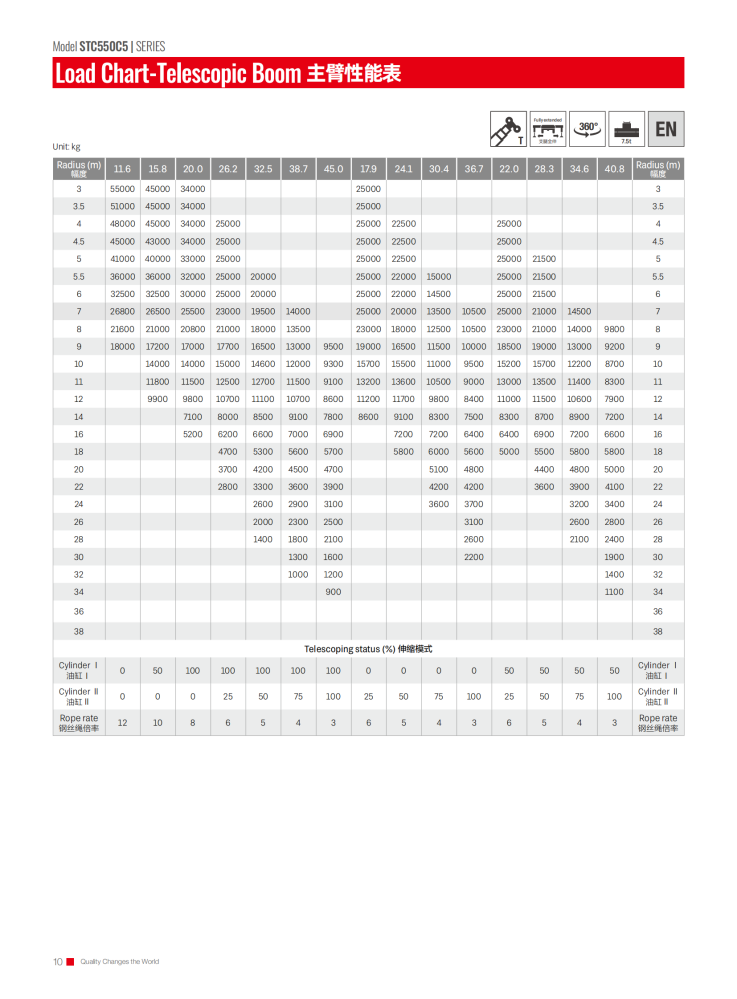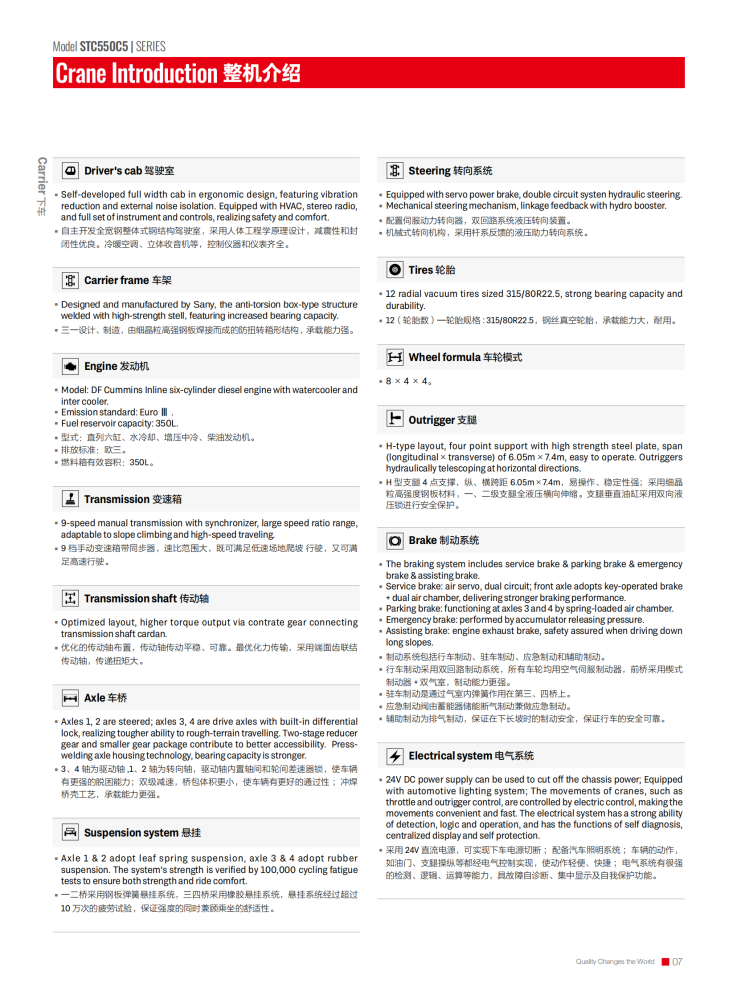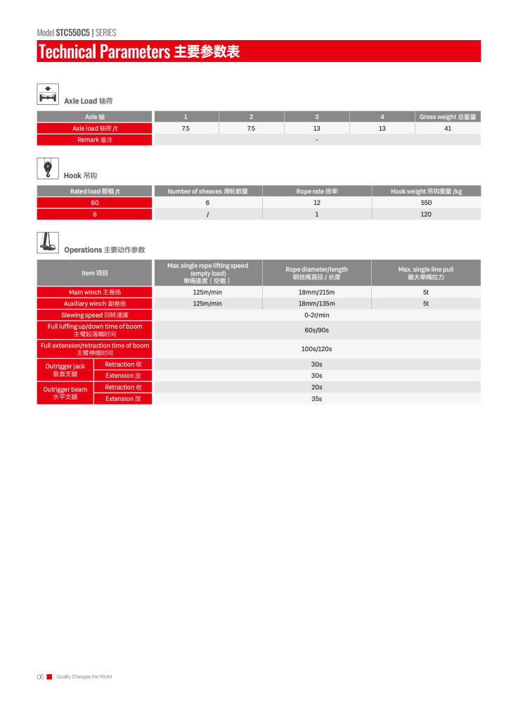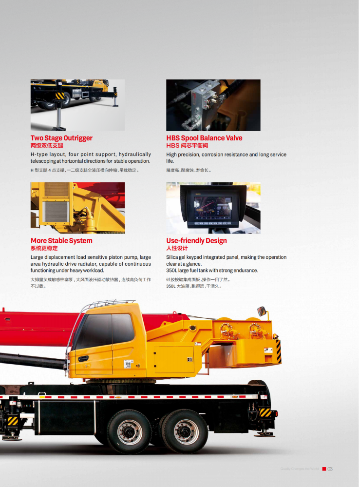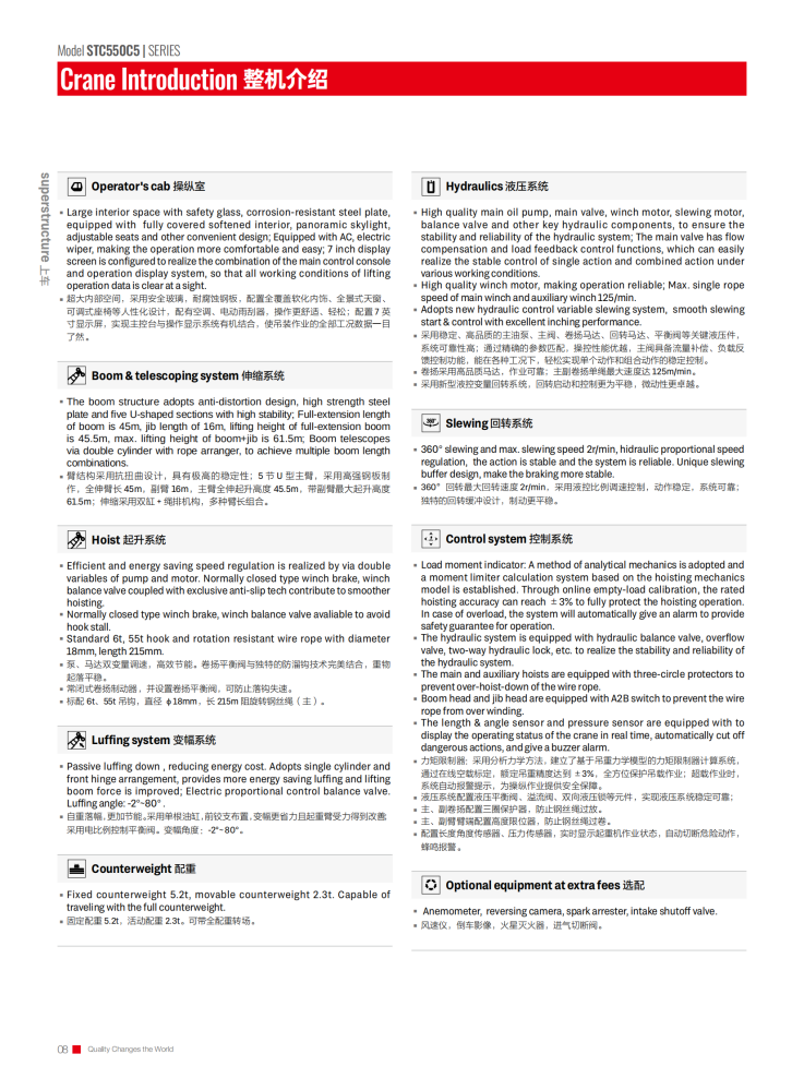 The STC550C5 is a high-efficiency 55-ton truck crane. It offers excellent lifting performance, with a maximum lift capacity of 55 tons and a lifting torque of 2,156 kN·m. Its main boom is 32.1 meters long, reaching a maximum reach of 47.5 meters, and its maximum lifting height is 64 meters. Powered by a powerful Yuchai 360-horsepower engine and a Fast Gear twin-intermediate shaft, the crane boasts a maximum speed of 85 km/h and a maximum gradeability of 47%. Equipped with 325/95R24 and 315/80R22.5 tires, it boasts an outrigger span of 7.7 meters horizontally and 6.24 meters vertically, providing excellent stability.