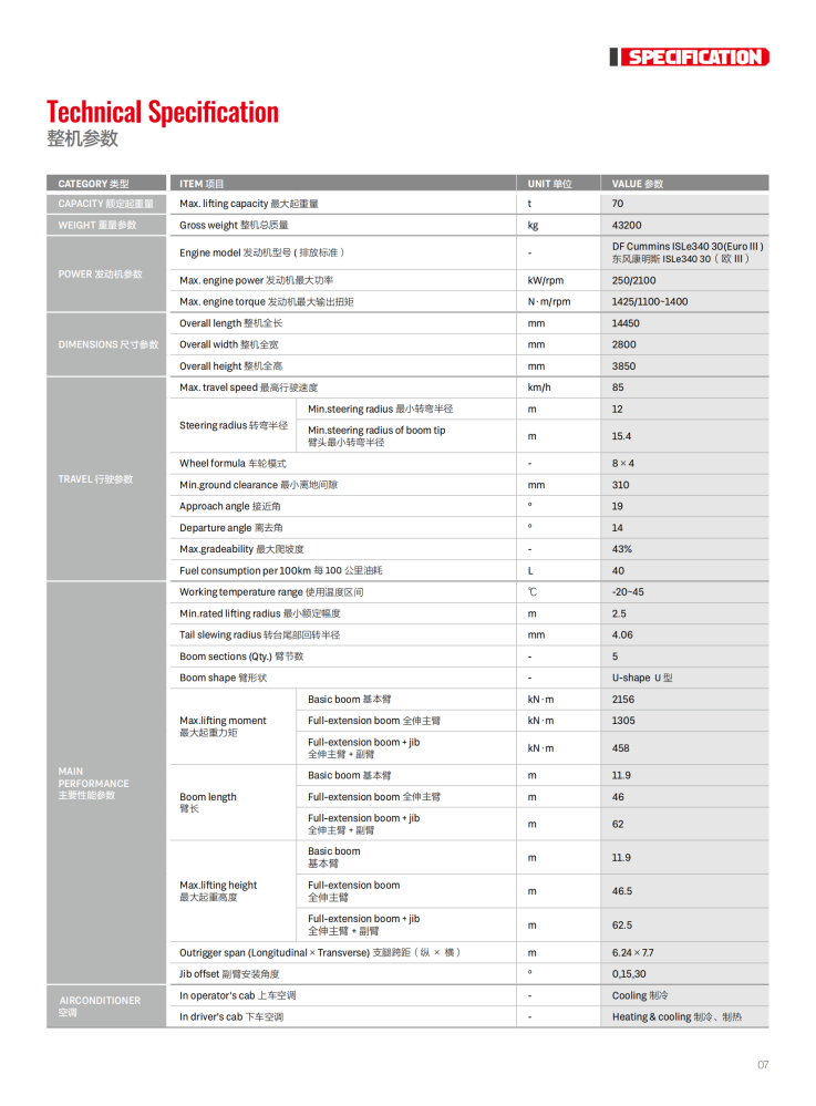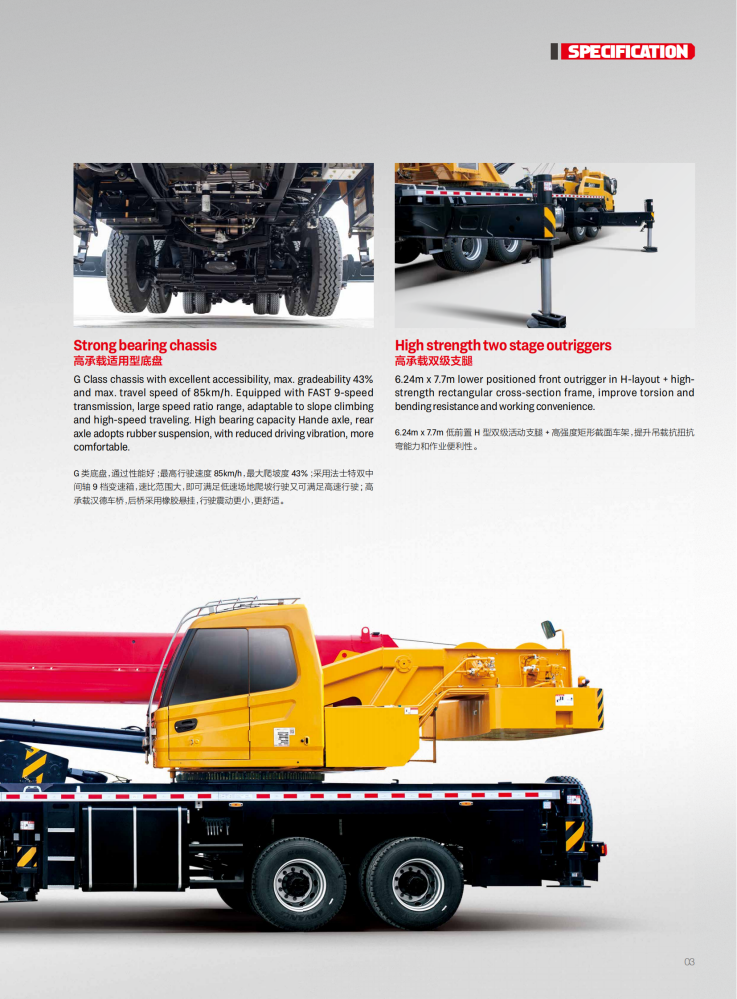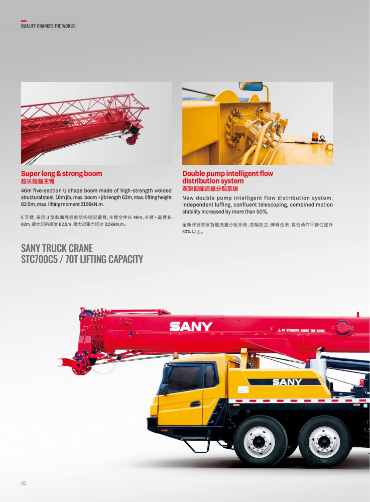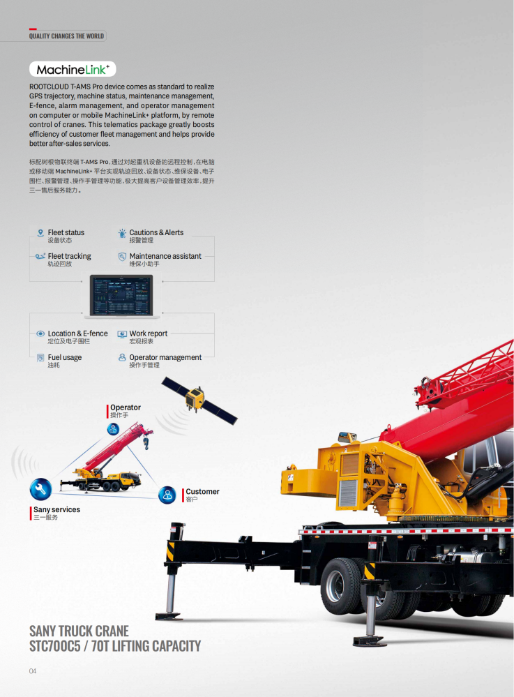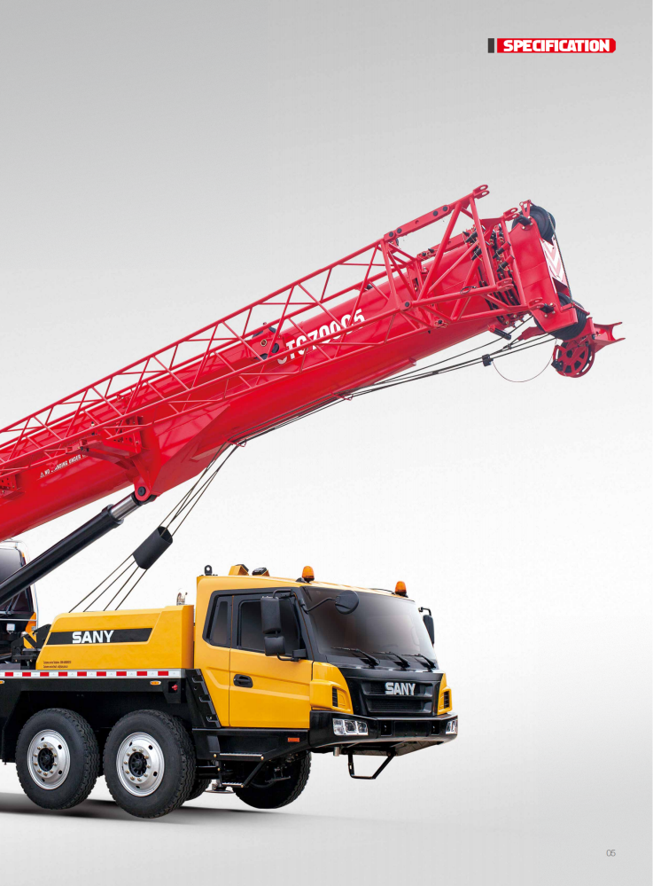 The STC700C5 is a 70-ton truck crane with exceptional lifting performance. It has a maximum lift capacity of 70 tons and a lifting torque of 2,156 kN·m. Its five-section, large-section U-shaped main boom reaches 46 meters at full extension, and is equipped with a 16-meter jib, expanding its reach for high-altitude and long-distance operations.