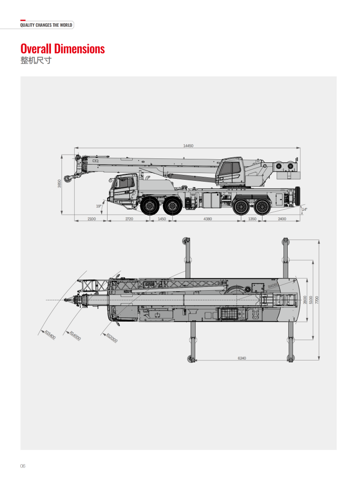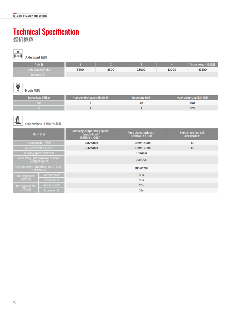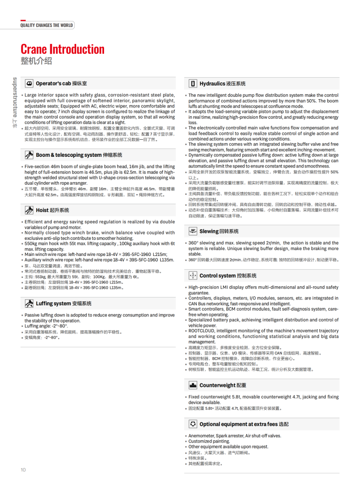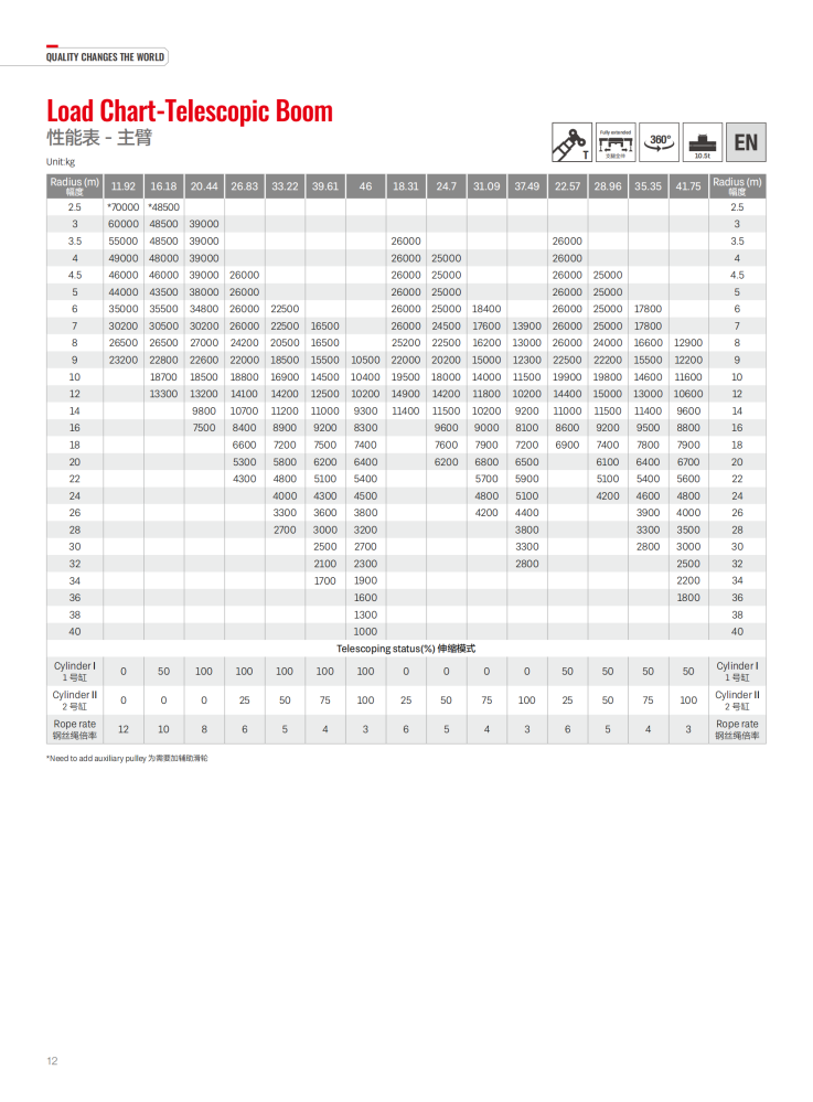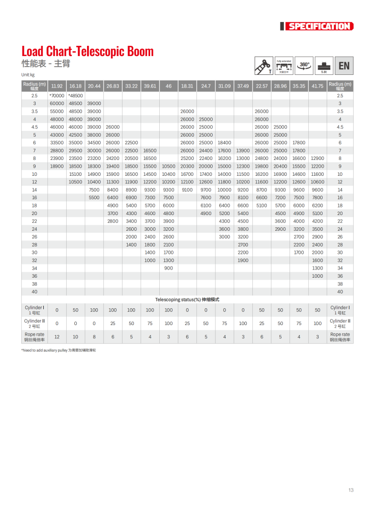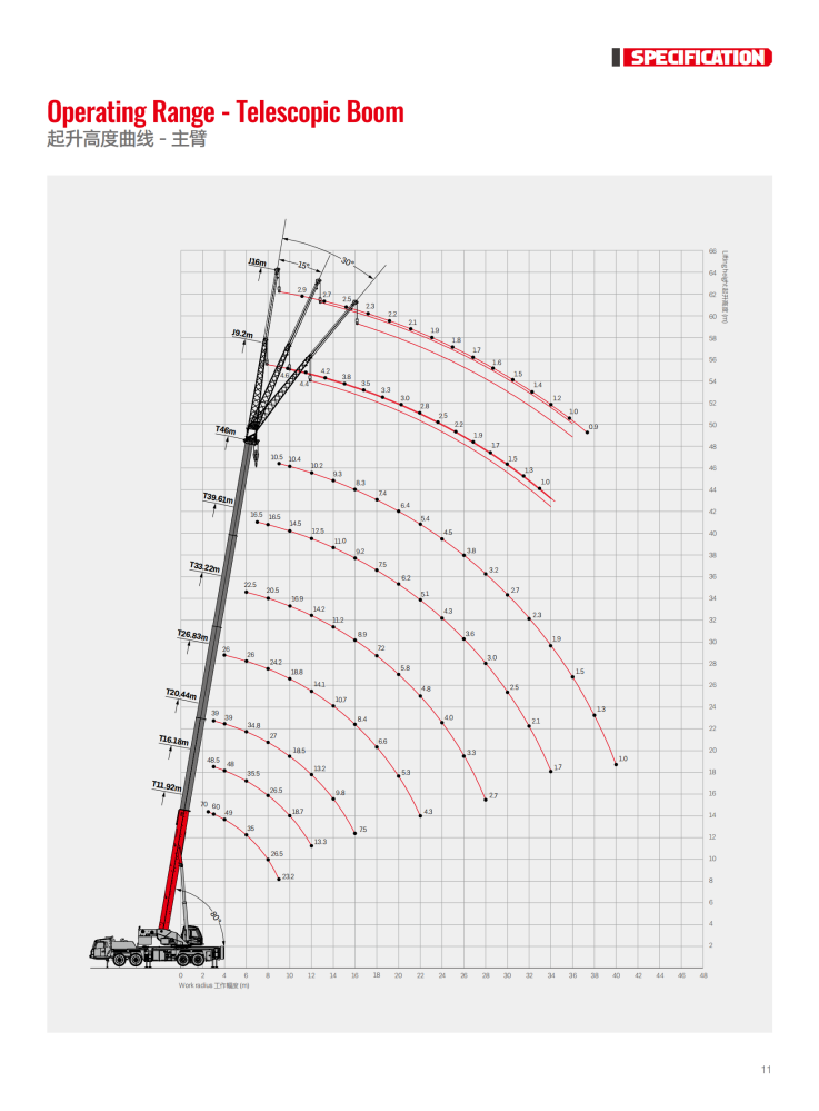 The STC700C5 is a 70-ton truck crane with exceptional lifting performance. It has a maximum lift capacity of 70 tons and a lifting torque of 2,156 kN·m. Its five-section, large-section U-shaped main boom reaches 46 meters at full extension, and is equipped with a 16-meter jib, expanding its reach for high-altitude and long-distance operations.