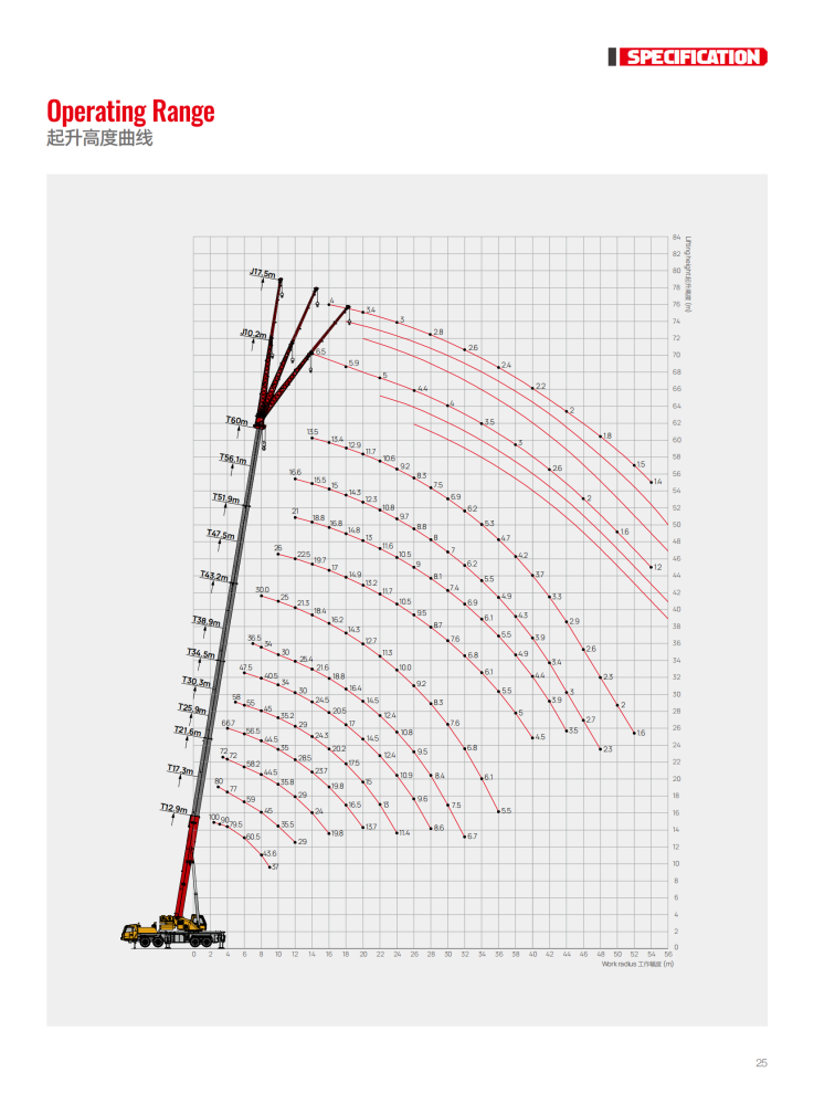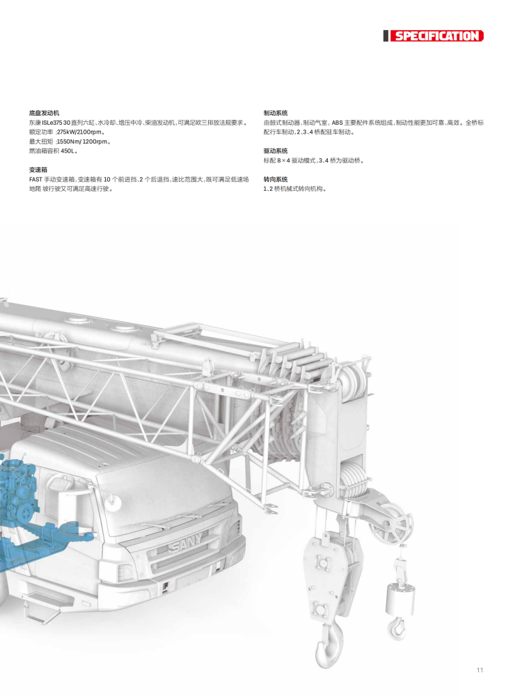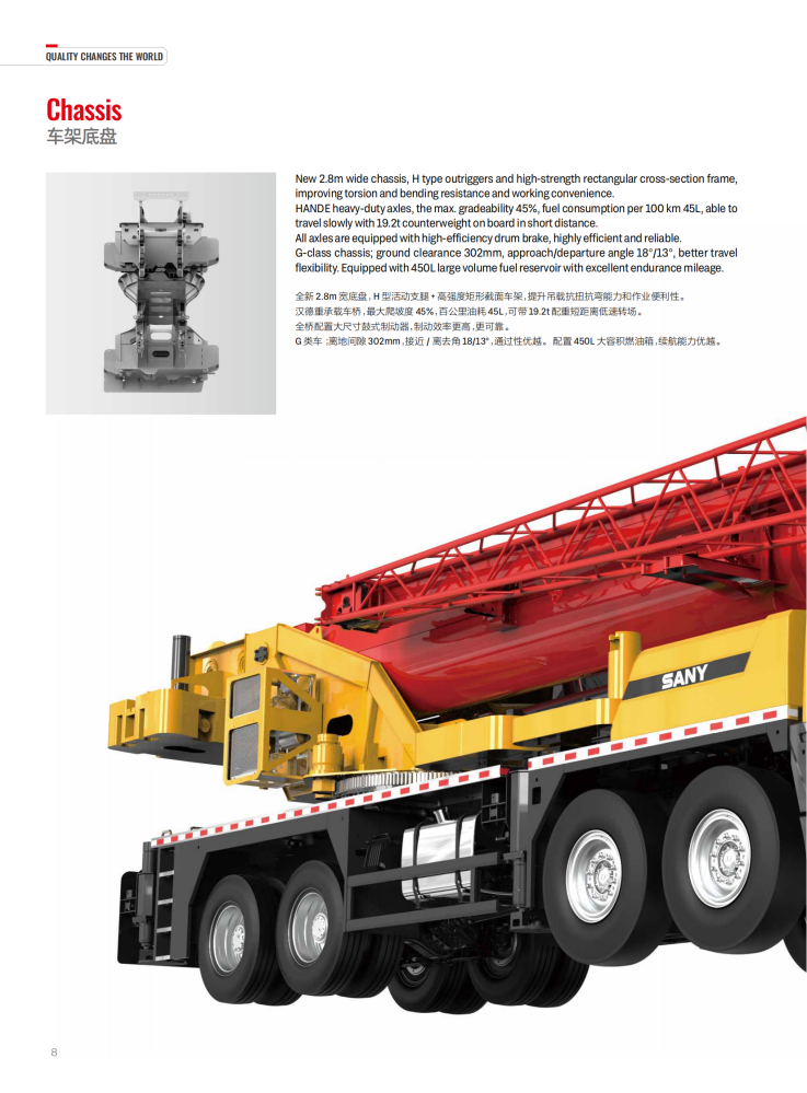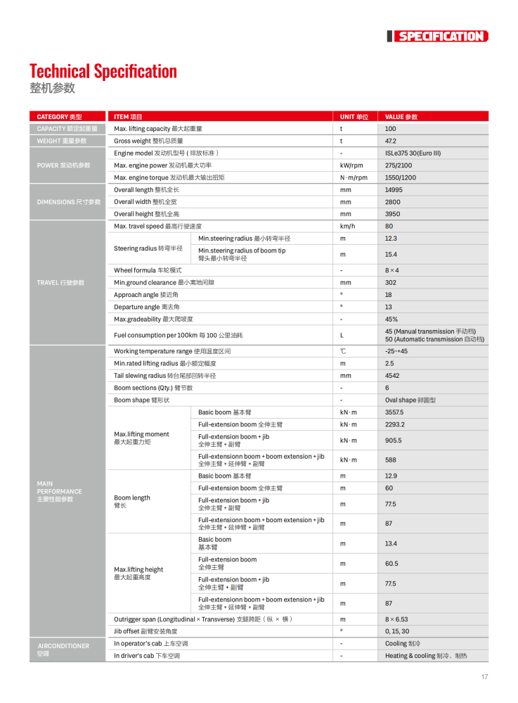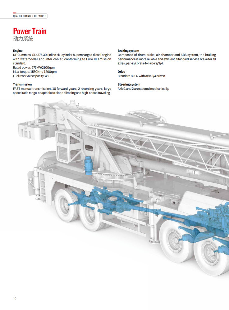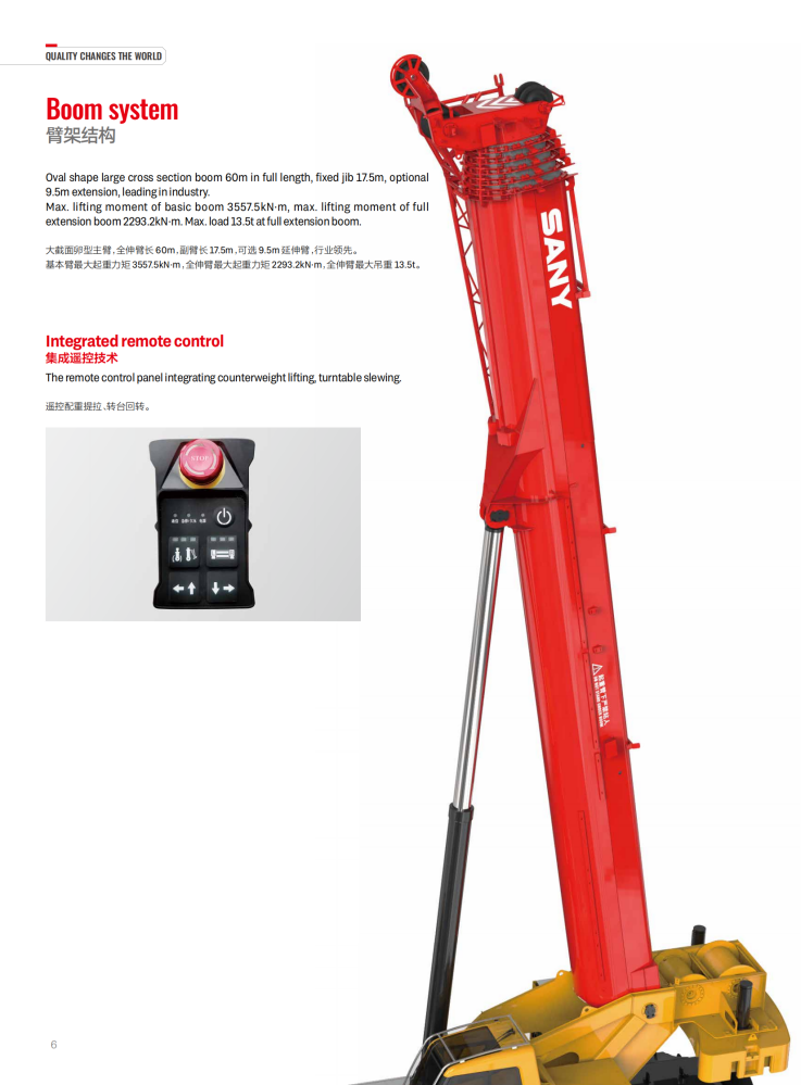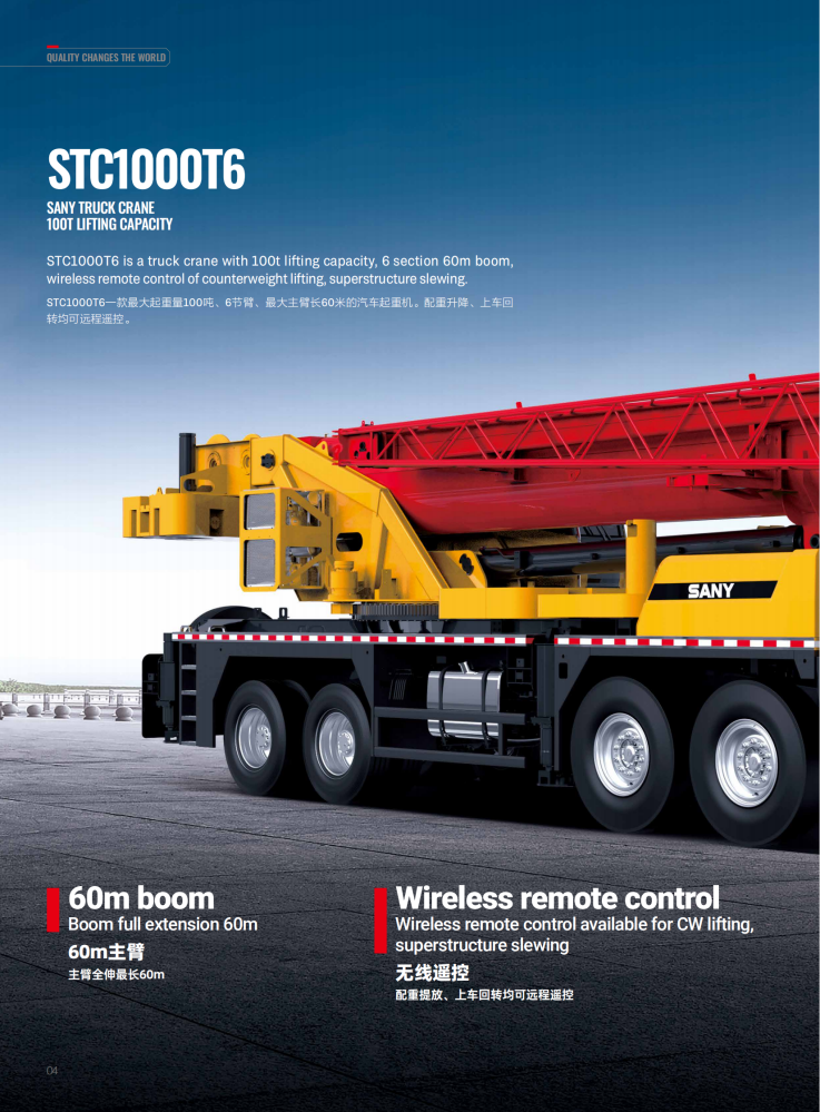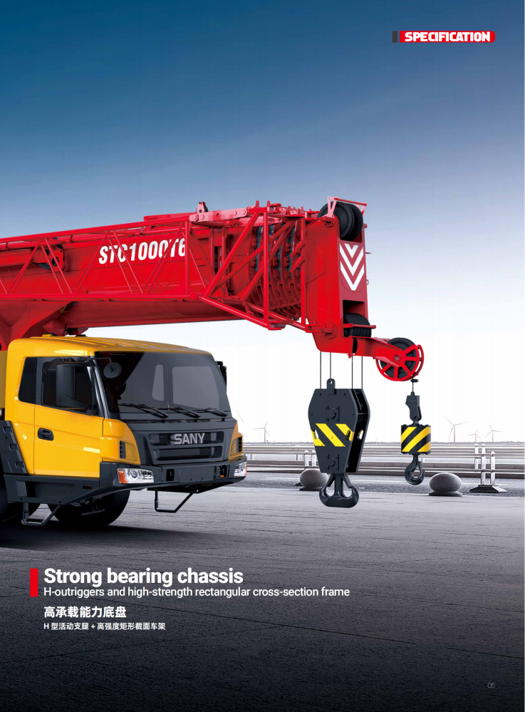 The STC1000T6 is a 100-ton truck crane with exceptional lifting capabilities. It has a maximum lifting capacity of 100 tons and a maximum lifting torque of 3557.5 kN·m. Its six-section boom reaches 60 meters when fully extended, and comes standard with a 27-meter jib. Its maximum lifting height is 87 meters, allowing it to cover a wide range of operating areas. Its powerful powertrain and reliable transmission ensure excellent driving performance.