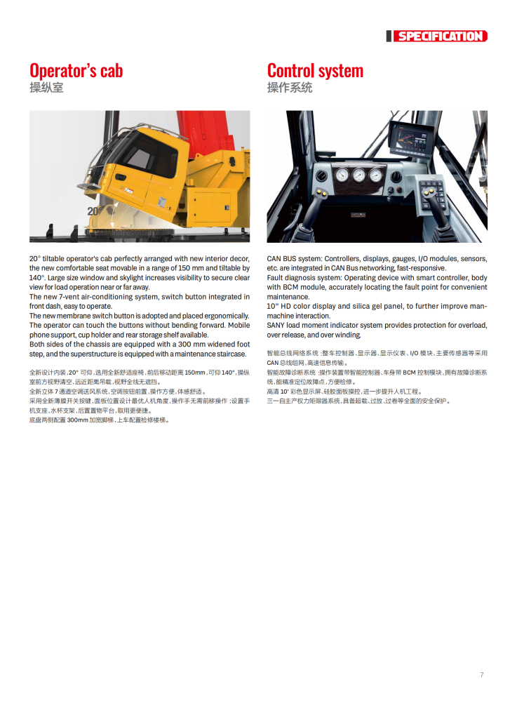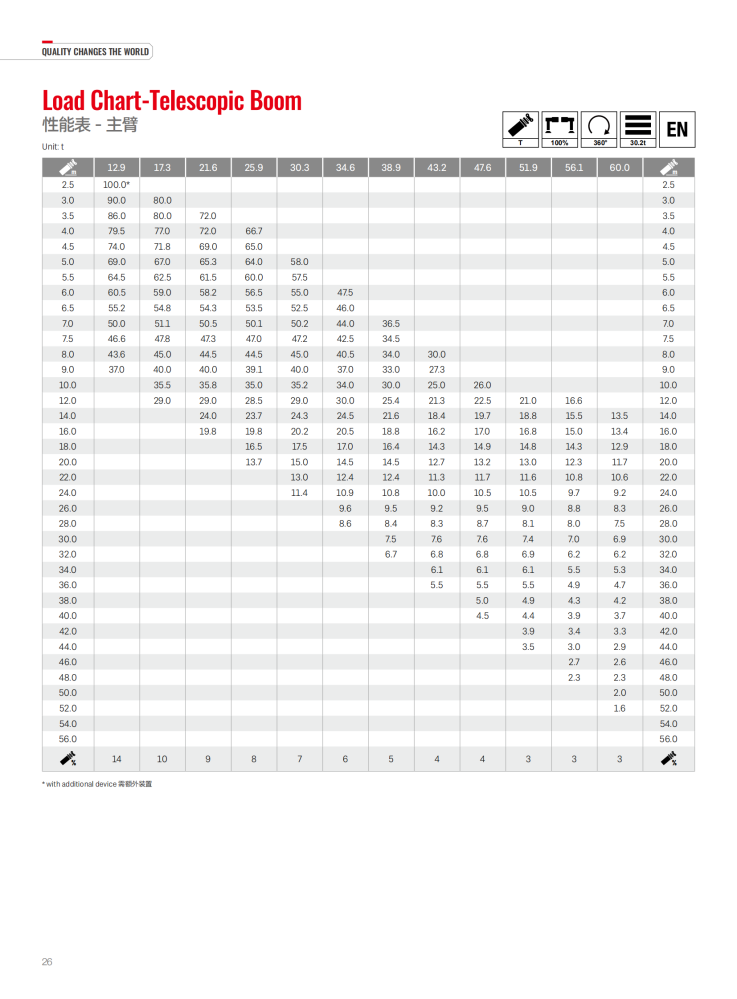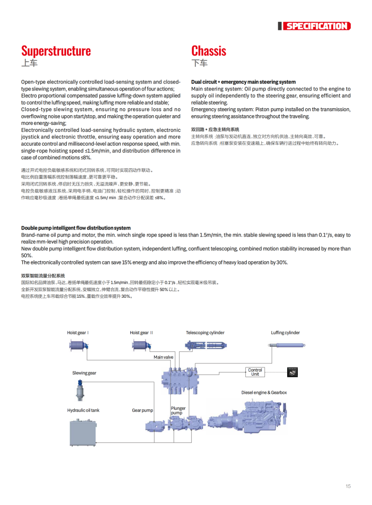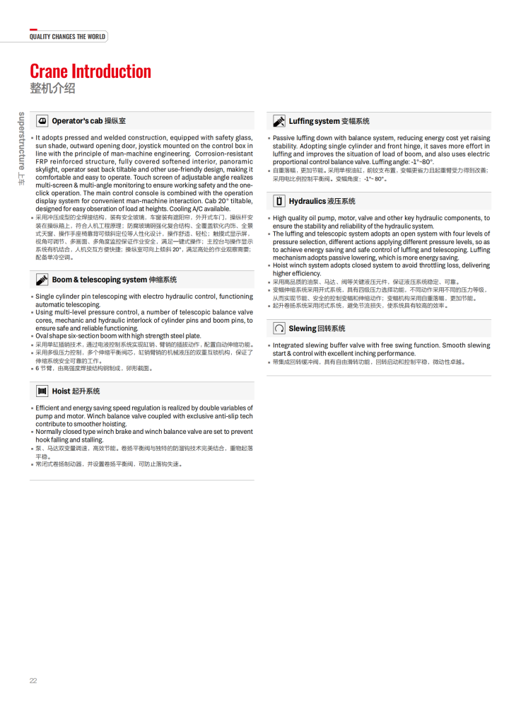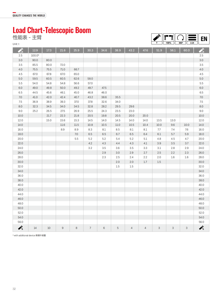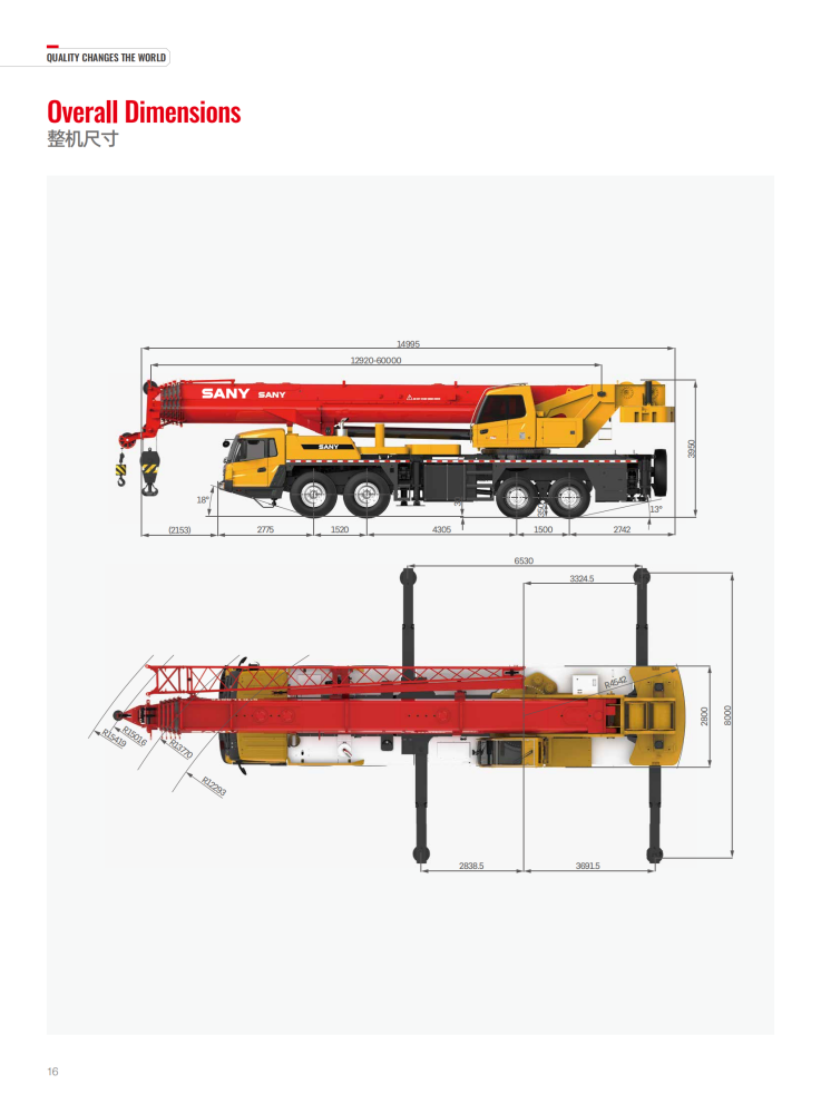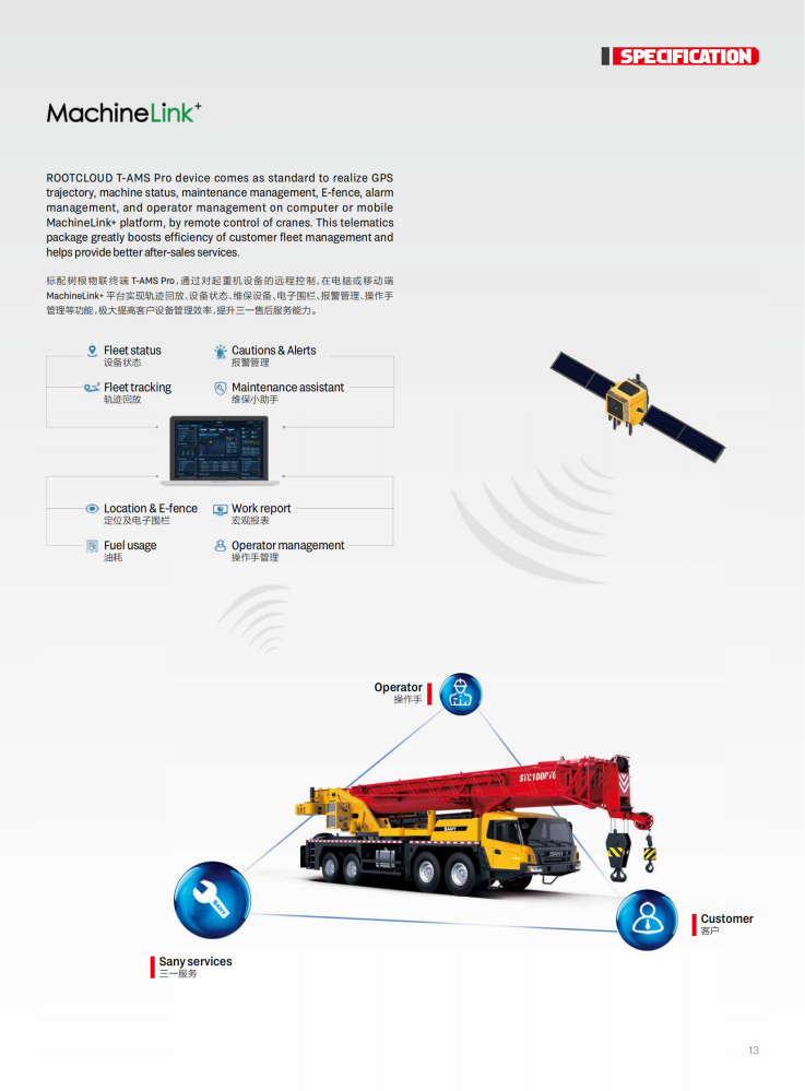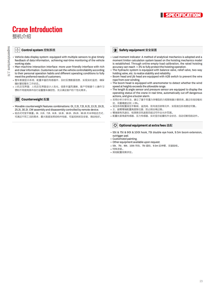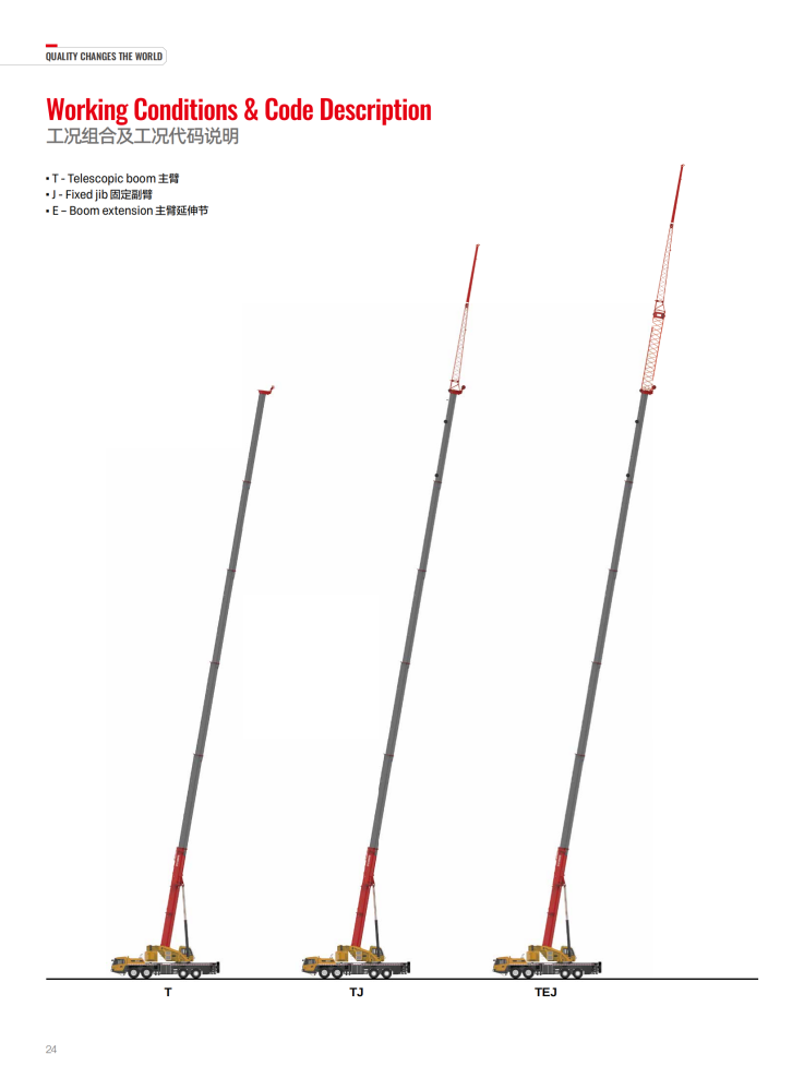 The STC1000T6 is a 100-ton truck crane with exceptional lifting capabilities. It has a maximum lifting capacity of 100 tons and a maximum lifting torque of 3557.5 kN·m. Its six-section boom reaches 60 meters when fully extended, and comes standard with a 27-meter jib. Its maximum lifting height is 87 meters, allowing it to cover a wide range of operating areas. Its powerful powertrain and reliable transmission ensure excellent driving performance.