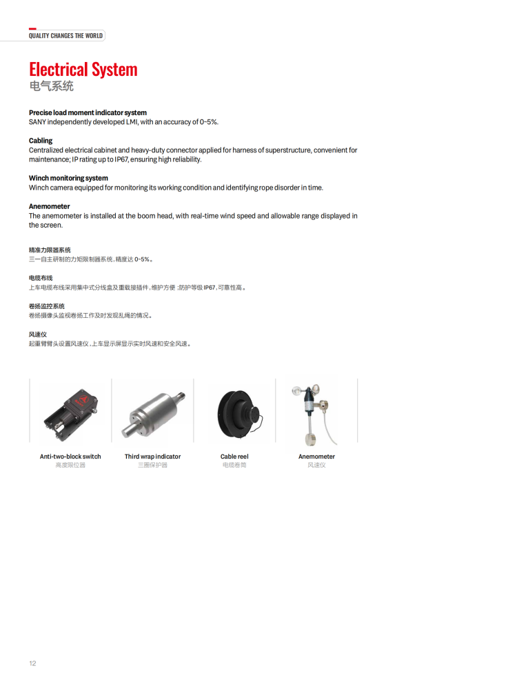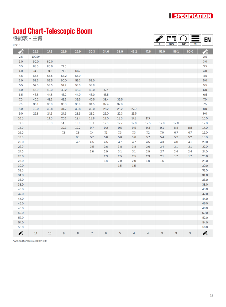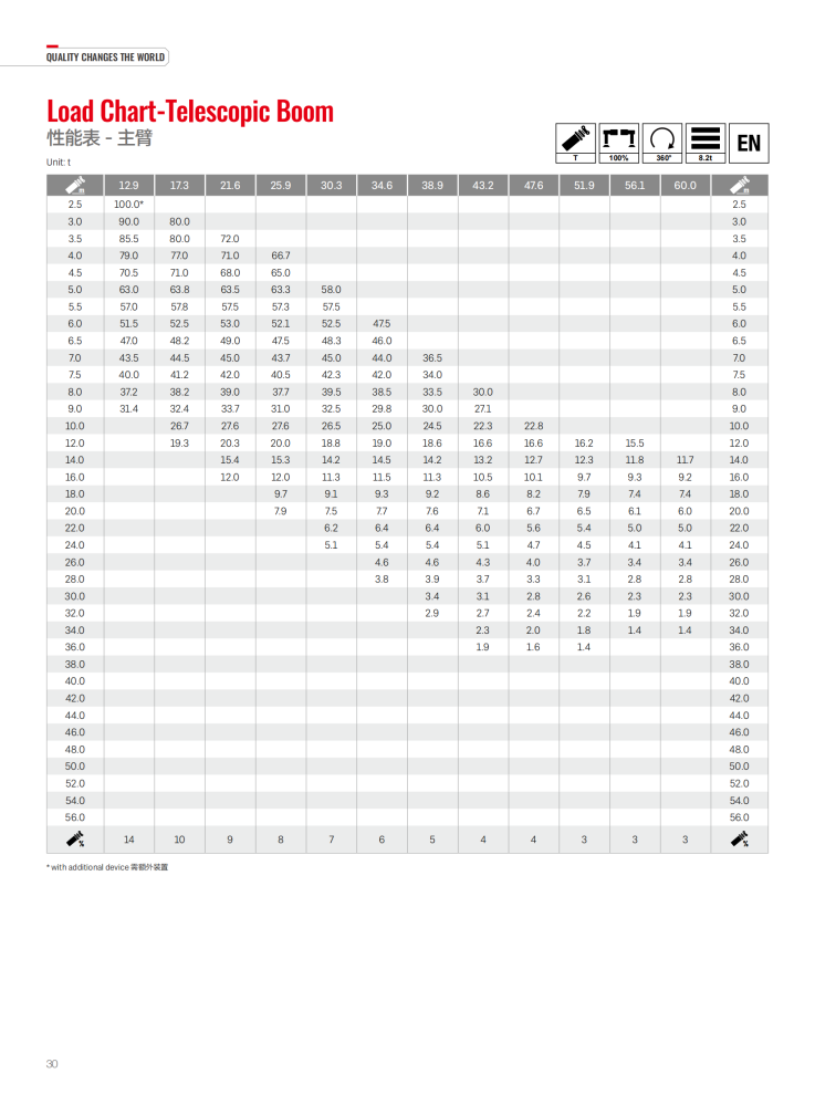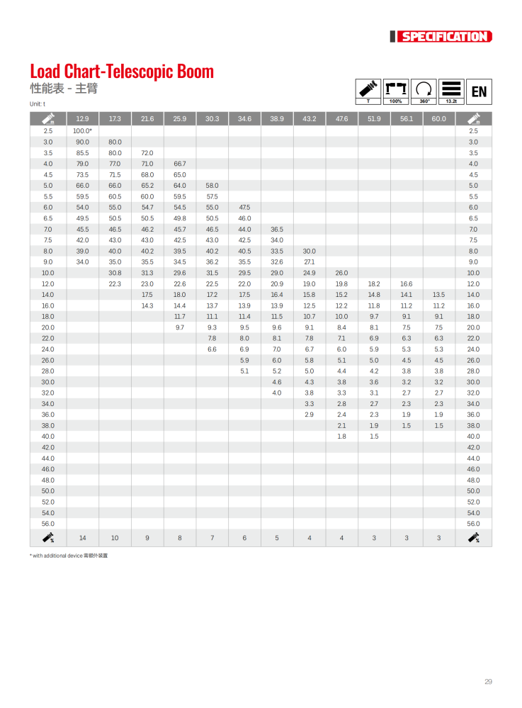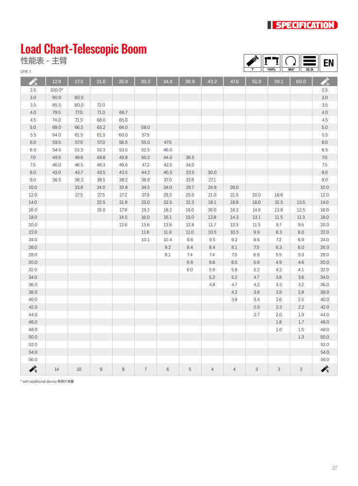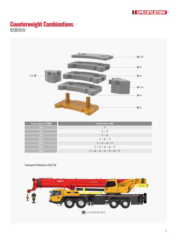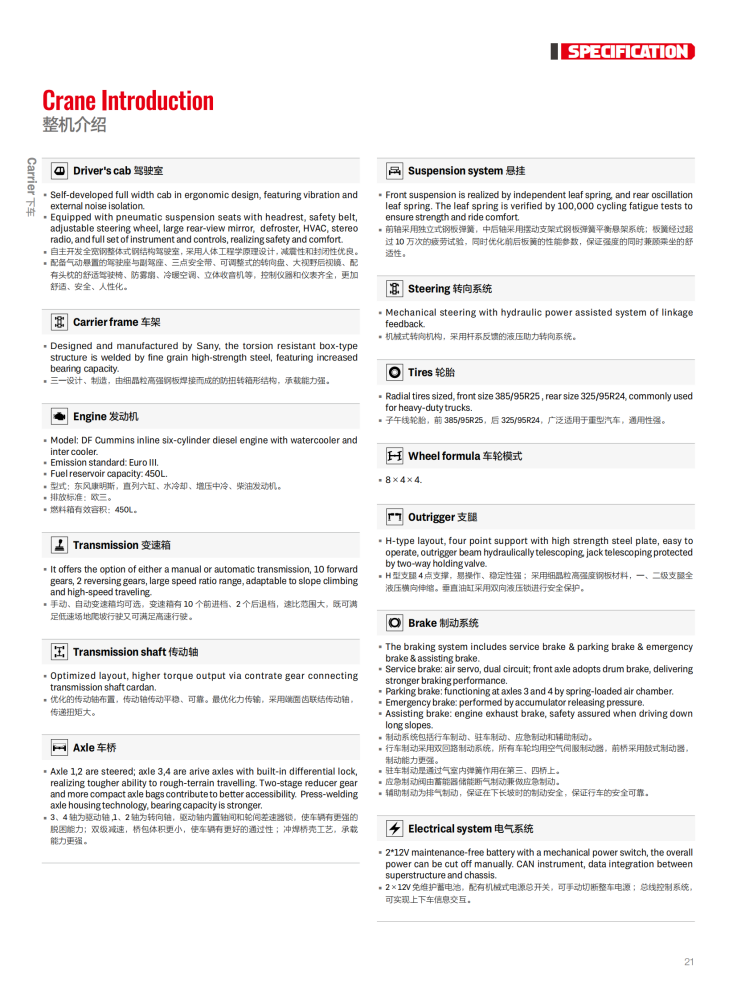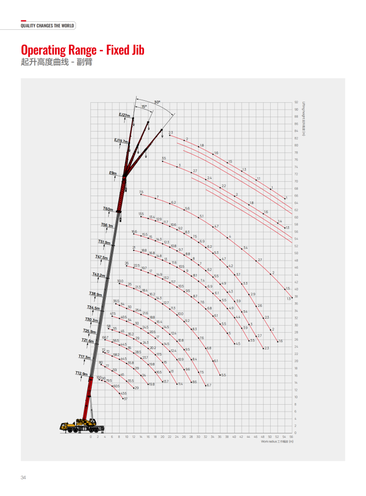 The STC1000T6 is a 100-ton truck crane with exceptional lifting capabilities. It has a maximum lifting capacity of 100 tons and a maximum lifting torque of 3557.5 kN·m. Its six-section boom reaches 60 meters when fully extended, and comes standard with a 27-meter jib. Its maximum lifting height is 87 meters, allowing it to cover a wide range of operating areas. Its powerful powertrain and reliable transmission ensure excellent driving performance.