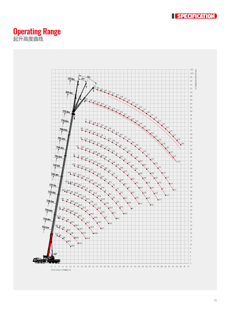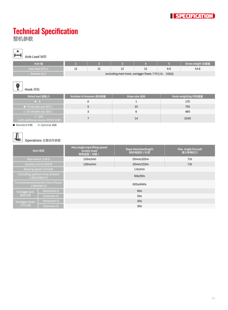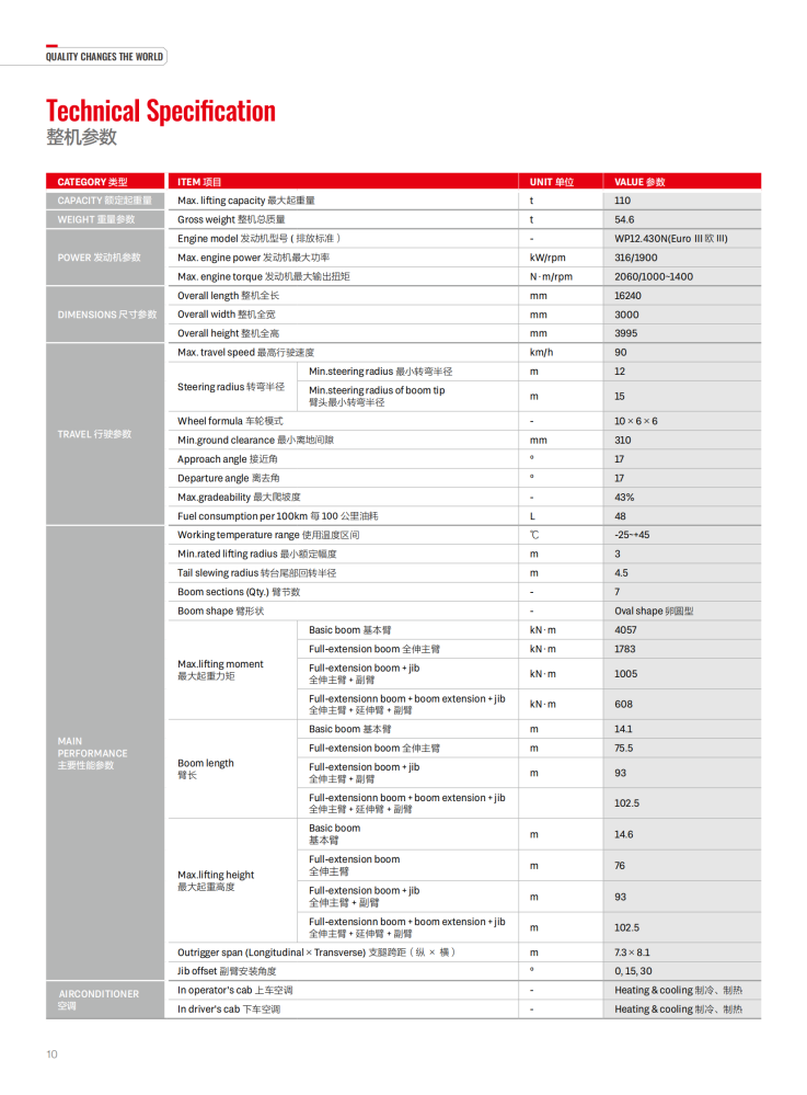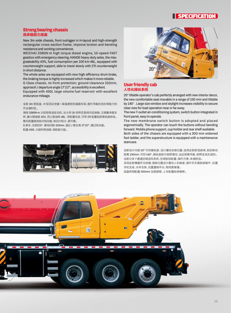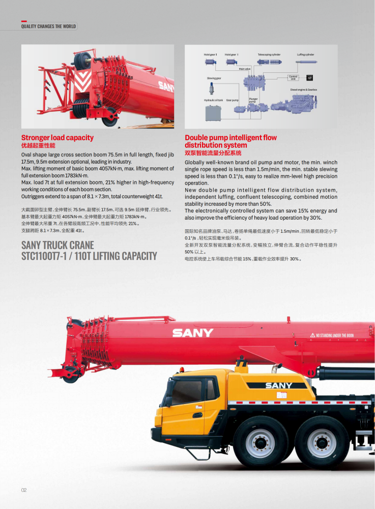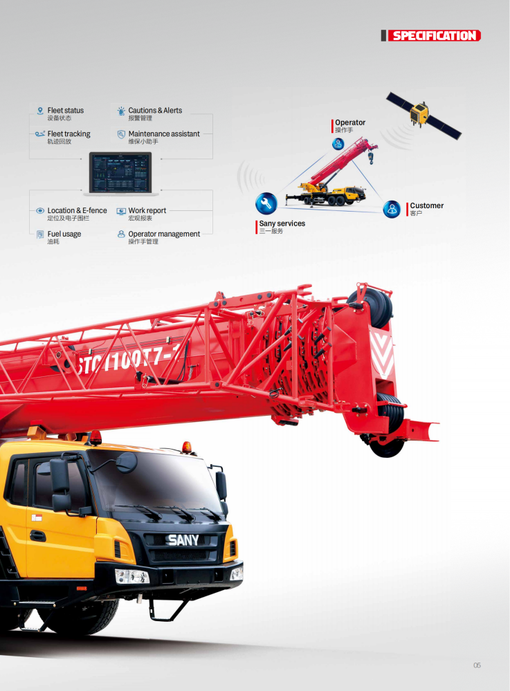 The STC1100T7-1 is a 110-ton truck crane with exceptional lifting capacity. Its maximum lifting capacity reaches 110 tons. Its seven-section main boom reaches a full extension of 70 meters. With the jib, it reaches a maximum lifting height of 102.5 meters, covering a wide range of operating areas. Its powerful power and stable and reliable transmission ensure excellent driving performance. Its advanced control system ensures precise and convenient operation.